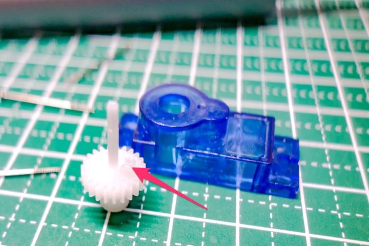大きさの違うギアが数個配置されていますが、一番上のサーボホーンを固定するギアの下面にストッパーが付いています。