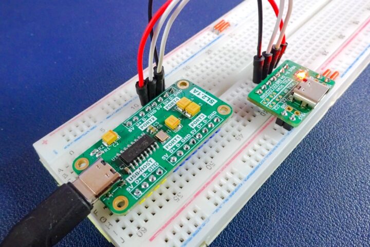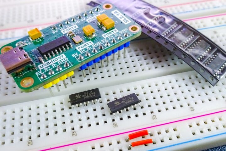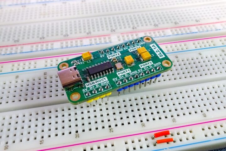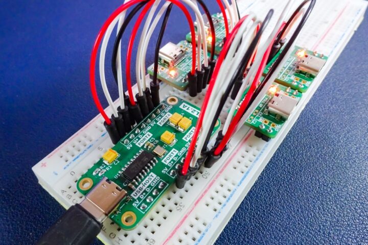 デバイス側の4ポートはブレッドボードで使いやすいようにUSB端子は取り付けていないので、電源ライン(VBUS/GND)とデータライン(D+/D-)をUSB端子のピッチ変換基板などに接続して使う形となります。