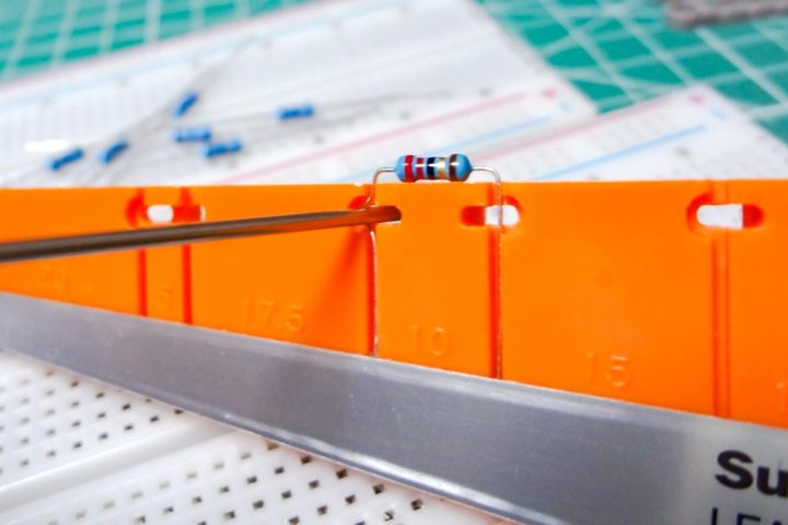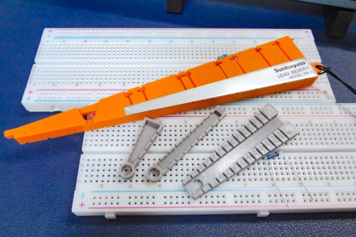 リードベンダーを使うと抵抗やダイオード、トランジスタといったパーツのリード線を一定間隔に折り曲げることが出来るので、基板に配置した際の仕上がりが綺麗に出来ますね!