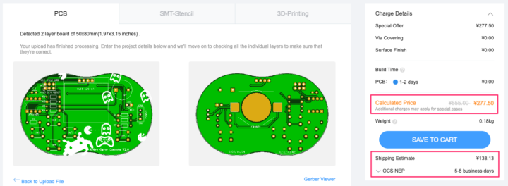 あとはカートに入れて決済するわけですが、JLCPCBでの発注方法はこちらの記事で詳しく解説しているので初めての場合は参考にして下さい。