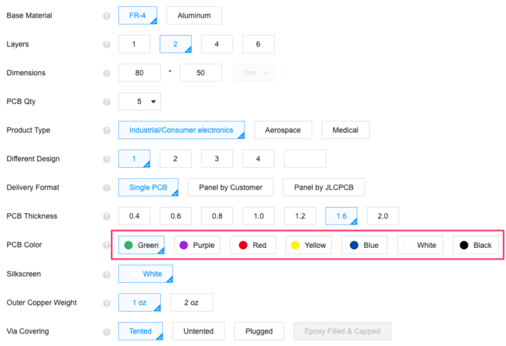 基板色は今回青レジスト色を選択しましたが、お好みで変更して下さいね。(追加料金はかかりません)