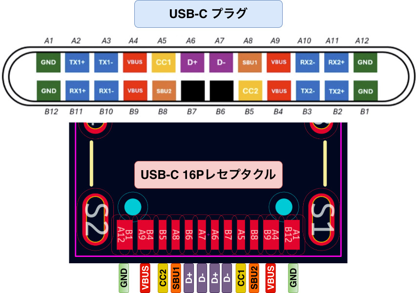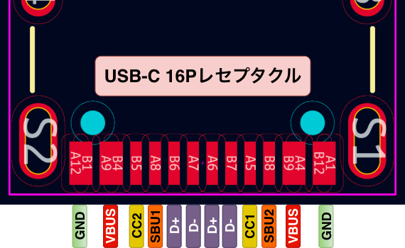 フル結線のUSB-Cレセプタクルには24ピンが備わっていますが、全てを使用する必要はなく、USB2.0対応のものでは16ピンタイプのものがよく使われます。(USB3.0のTX/RXがカットされている)