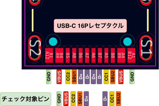 Type-C端子の各ピンの後段には既に回路が接続された状態なので、どのようなチェック方法が良いのかまず考えていきます。