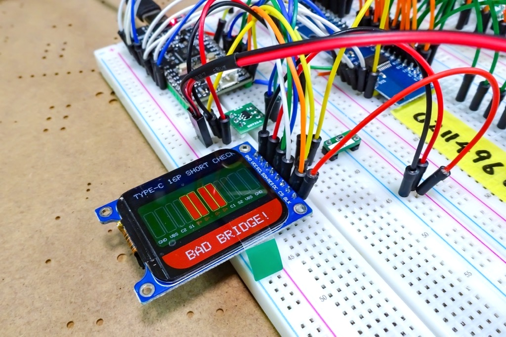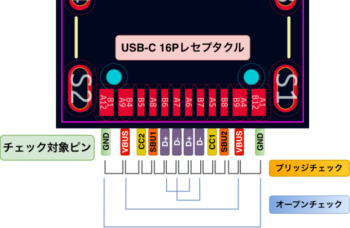 これらを踏まえると、ブリッジ(短絡)状態をチェックすべき対象は、VBUS / GND / CC1 / CC2 / D+ / D- / SBU1 / SBU2 の実質8系統のピン間でのチェックということになります。