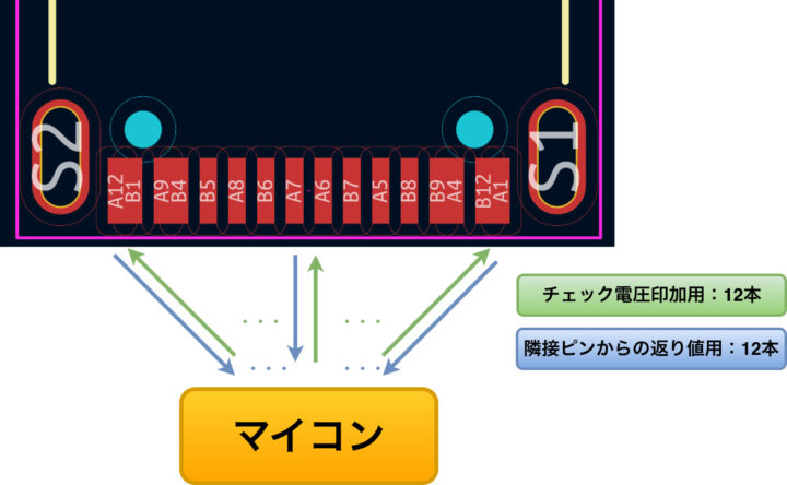 12ピン全てに対してチェック電圧を印加する「入力ピン(緑)」を接続し、同時に隣接するピンからの返り値(導通具合)を受け取る「出力ピン(青)」も配線する必要があります。