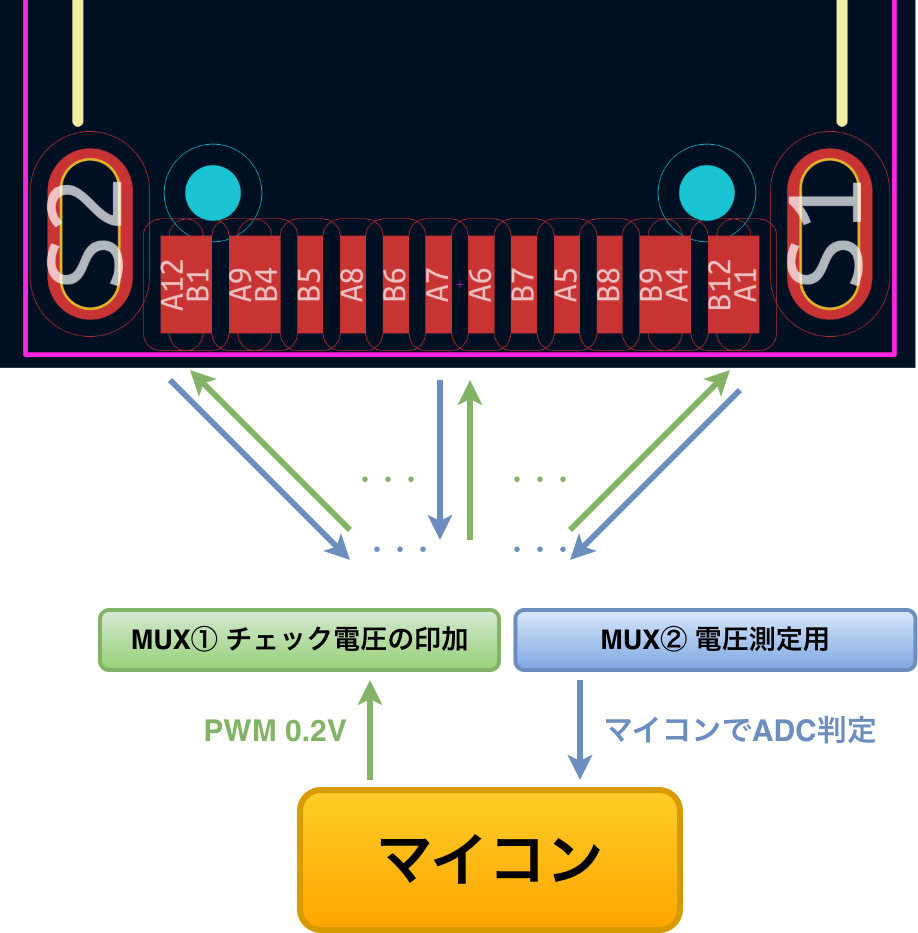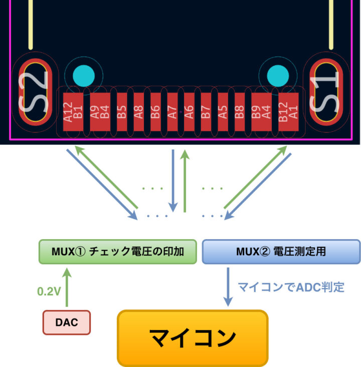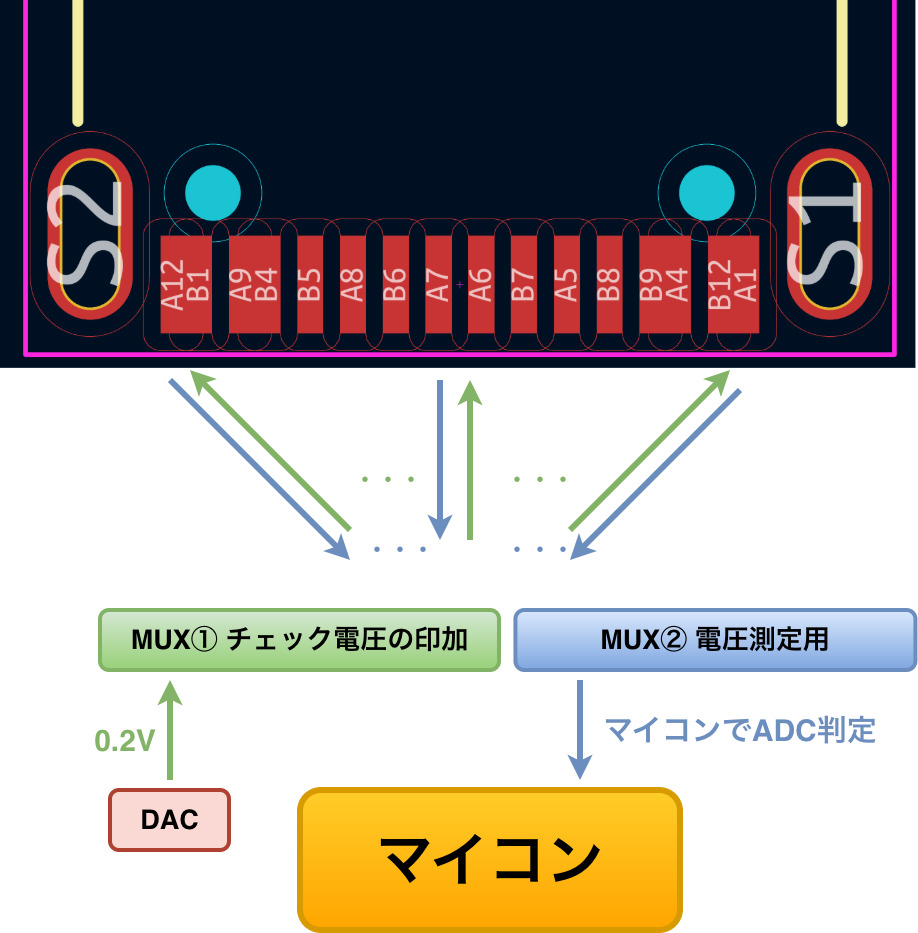 以上を想定して、測定電圧を0.2Vに設定しType-C端子の各ピンに印加して隣接するピンへの漏れ電圧や対面ピンへの到達電圧をADC(アナログ・デジタル変換)で判定するという方向性で進めることにしました。