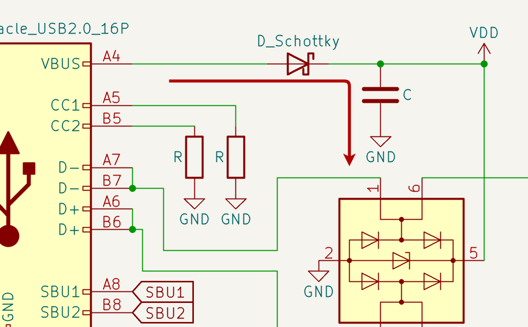 VBUSラインには、逆流防止用のショットキーバリアダイオードが直列に入っていることが多く、その先には大きな容量のコンデンサやパスコンなどが控えています。