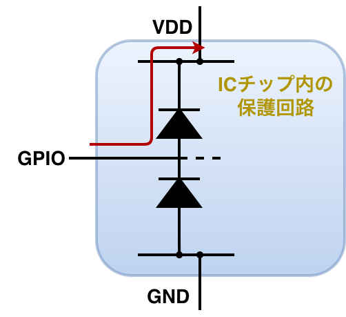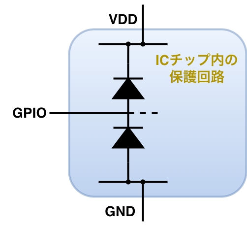 ICチップの電源がオフ状態で、短絡チェックのために仮にI/Oピンにこれ以上の電圧がかかった場合、GPIOピン → ダイオード → VDDという経路で電流が流れ込み、IC内部の他の回路に供給され悪影響を与える可能性があります。
