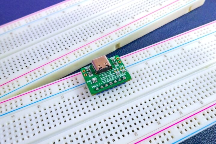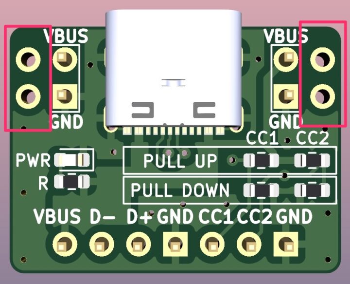 CC端子はケーブルの接続方向の検出(ケーブルを差し込む向き)や電源供給(USB Power Delivery:USB PD)のネゴシエーション、またデバイスの役割(ソース側 or シンク側)を決定する端子となりますが、特定の用途で固定して使用する場合に使えます。(もちろんブレッドボード上で下部のCC端子に接続して使用も出来ます)
