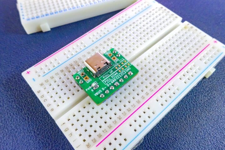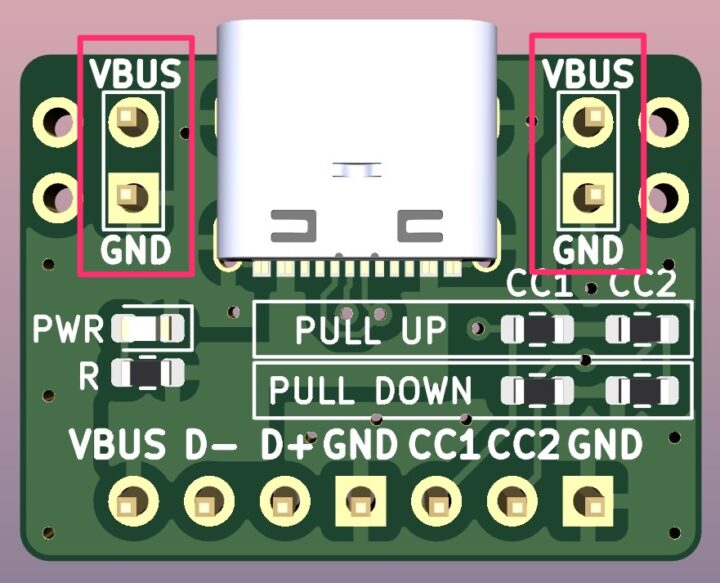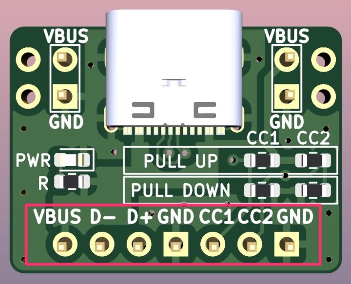 Type-CコネクタからのVBUS・GND・D+・D-・CC1・CC2は全て下部の端子に引き出し、ブレッドボードで使用出来るようにしています。