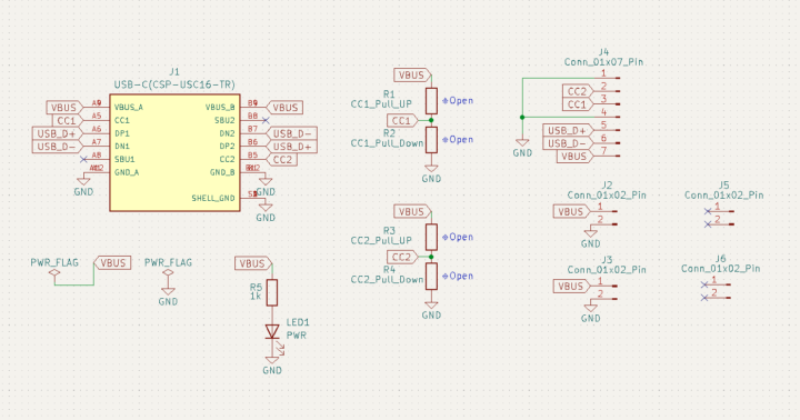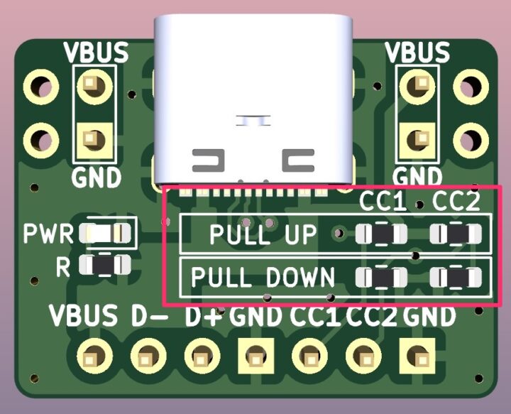 またあらかじめCC端子に5.1kΩのプルダウン抵抗を付けVBUS(USBケーブル)からの電源供給を5Vに限定したボードもよく見かけます。