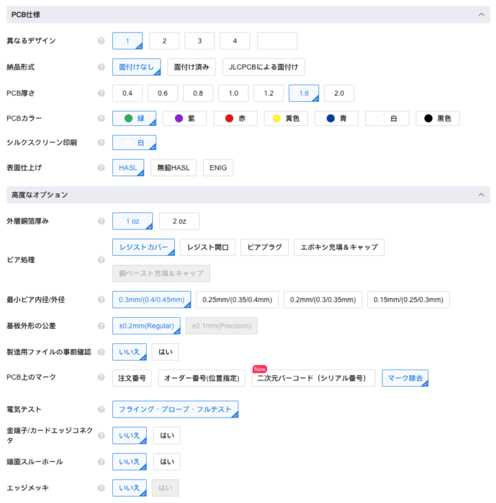 発注時の選択項目は特に特記すべきところはありませんが、このように発注しました。(PCBカラーはお好みで!)