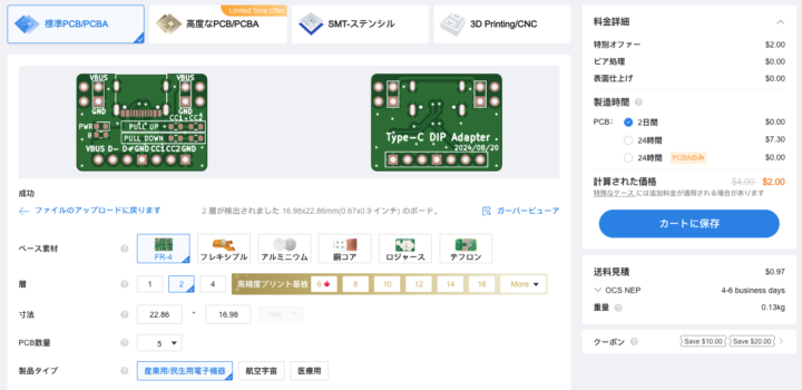 OCS NEPを選択し発注から1週間~10日前後で手元に基板が届くと思います。