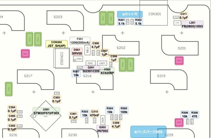 | コンデンサ (0603) | C301/C302/C303/C304/C305/C311 100nF C306/C309 4.7μF C307/C308 1μF C310 470nF | AliExpress |