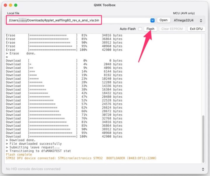 QMK Tookboxの[Flash]ボタンが押せる状態になるので、クリックしてファームウェアを書き込みます。