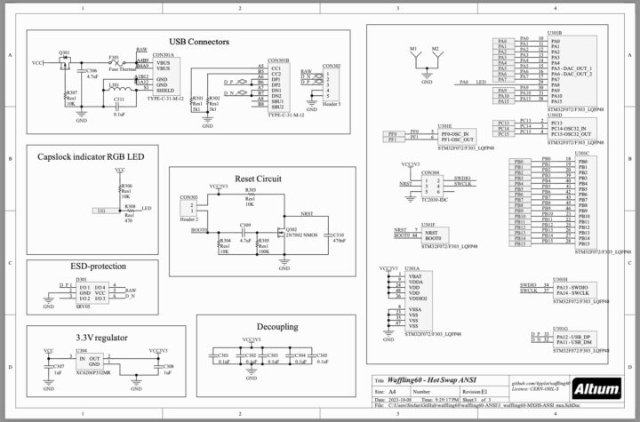 waffling60はオンボードSTM32で設計されたPCBとなっており、回路設計が非常に丁寧?参考になったのも作ってみようと思った要因の一つです!