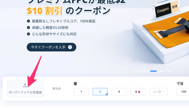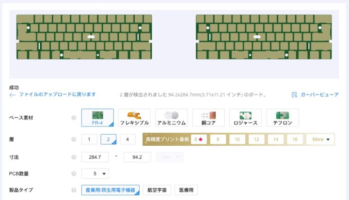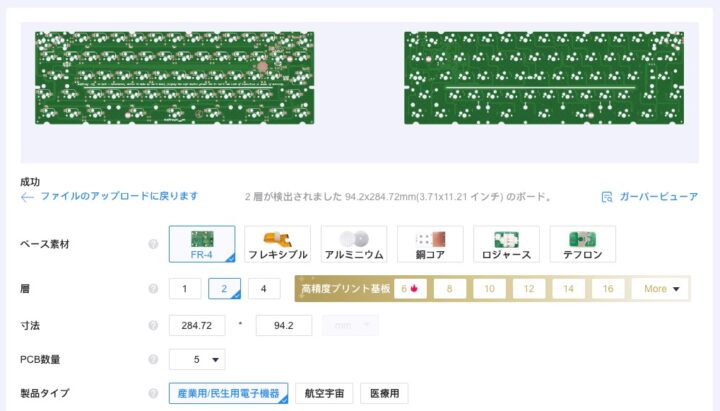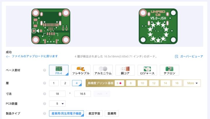 こちらもガーバーファイルをサイトにアップロードし同様に項目を選択します。