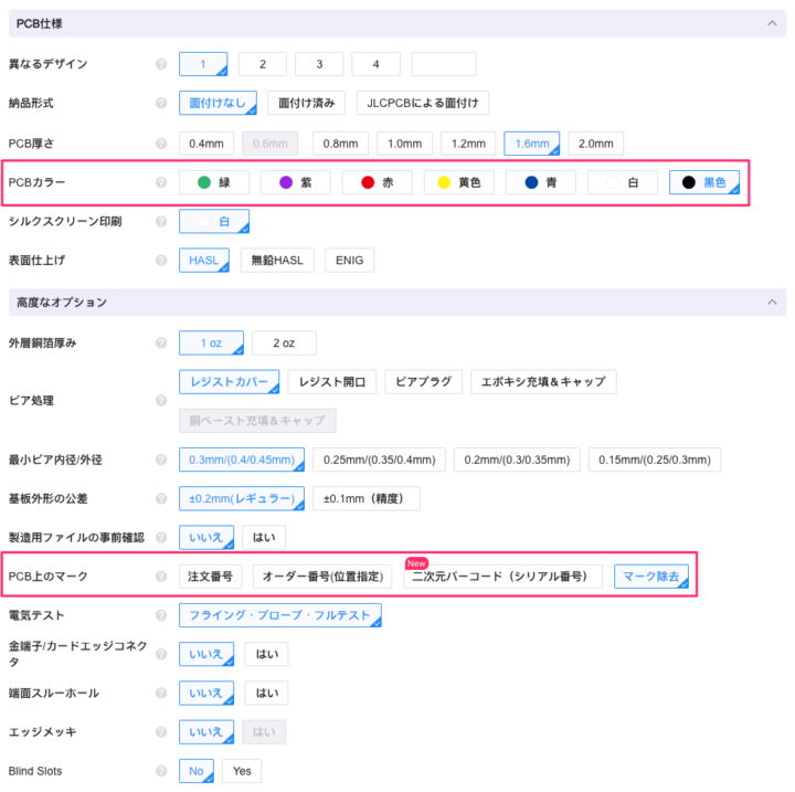 [PCB上のマーク]の[マーク除去]はJLCPCBでは無料で出来るオプションとなり、余計なシルクプリントがされないため選択しておいた方がいいでしょう。PCBカラーはお好みで!