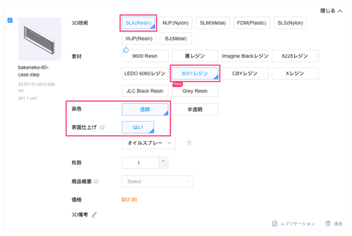 今回製作したケースは、アンダーグロー(LED)を活かすために、[SLA(Resin)]にある透明レジン[8001 レジン]を選択しました。