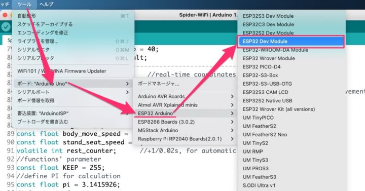 [ツール]→[ボード]へと進むと[ESP32 Arduino]という項目が追加されています。WeMos D1 R32はESP-WROOM-32互換ボードなので、この中にある[ESP32 Dev Module]を選択する事によりコンパイル&ボードにスケッチを書き込むことが出来ます。