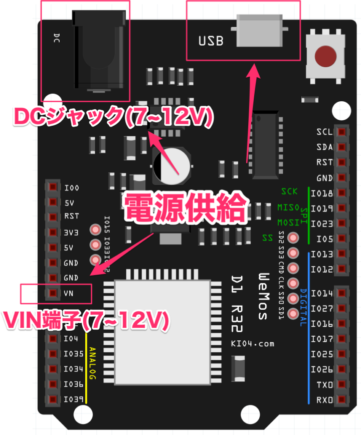電源供給方法は、Arduino Unoと同じです。