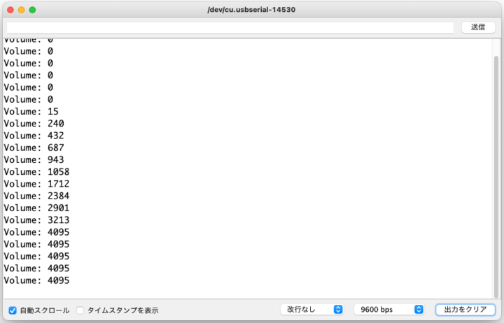 そしてArduinoの場合アナログ入力の分解能は10ビット(0~1023)ですが、WeMos D1 R32(ESP-WROOM-32)ではアナログ入力の分解能は12ビットとなっています。