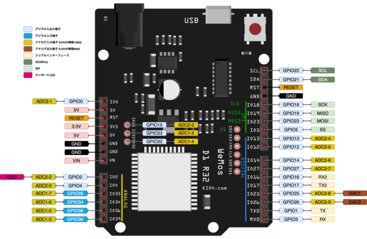 WeMos D1 R32のピン配列を見ておきます。
