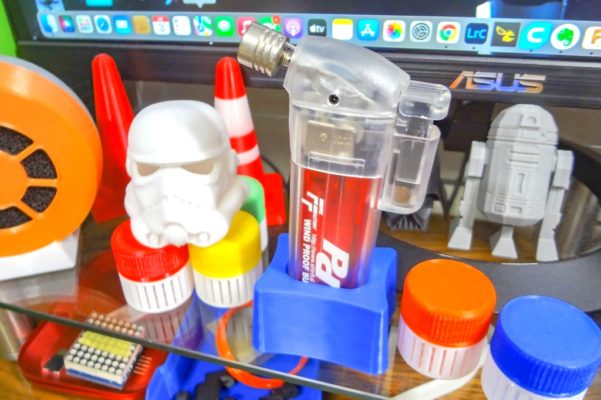 他製品にガス充填式のバーナーもあるようですが、3Dプリンタ用途としてはこれくらいの火力(ターボライターの火力を少し強めた程度です)の方が使いやすく、使い捨てライターを使うのでデスク作業などでも安心して使えると思います。