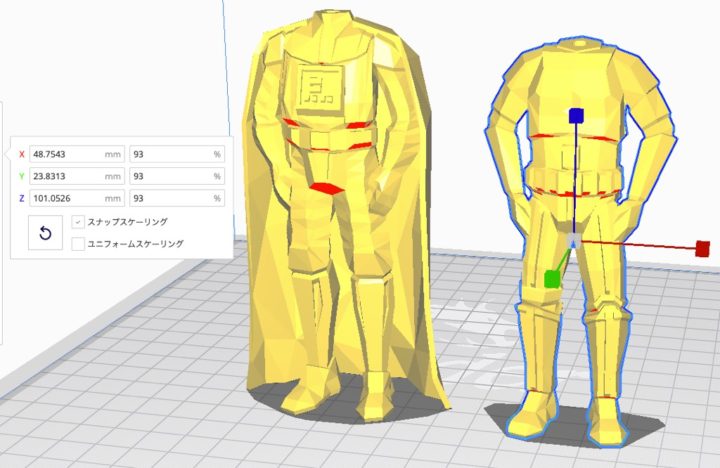 パーツが分割されていてサポートなしで出力出来るようになっていますが、R2-D2の出力だけは個別パーツのスケール調整をする必要がありました。