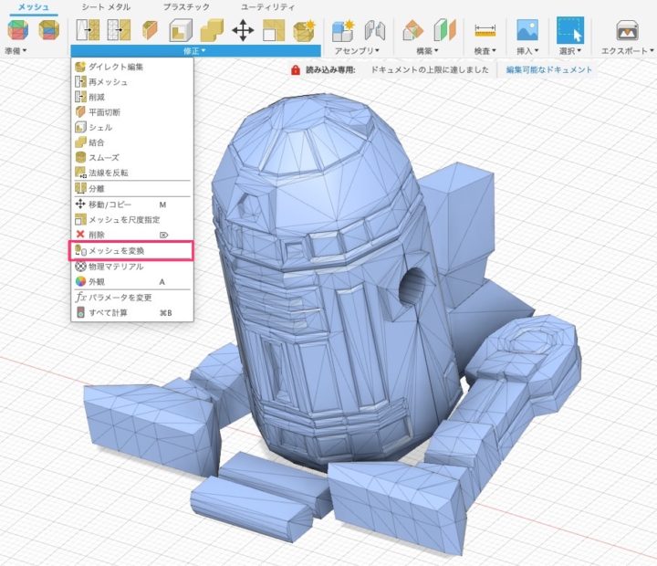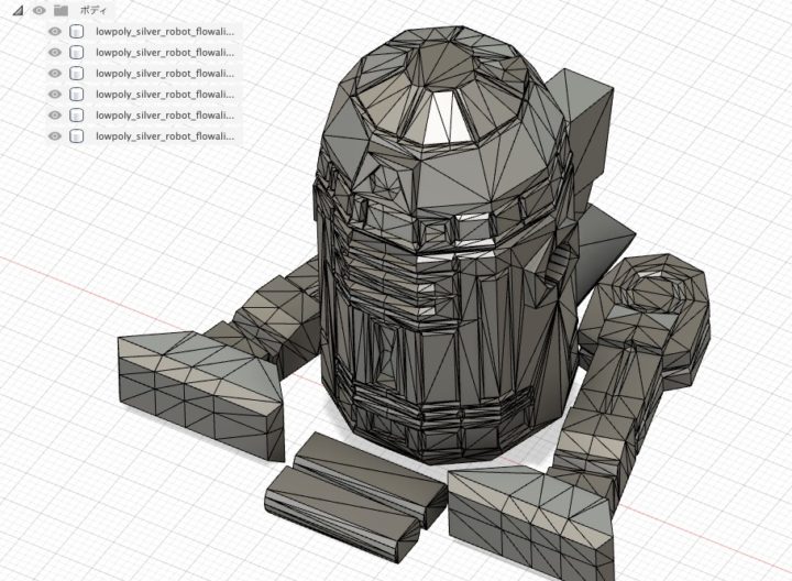 メッシュデータ(STLファイル)をFusion360に取り込み、[メッシュを変換]からソリッドボディーに変換すると繋がっていないパーツは全て個別のボディーとしてソリッド化する事ができます。