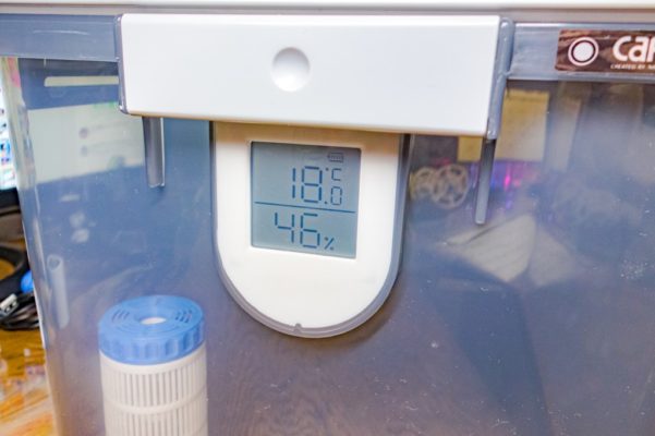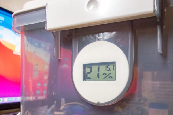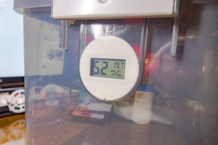 そしてドライボックス内と室内の温湿度を比較出来るように、小型温湿度計スタンドも作りました。