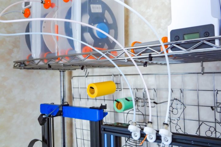 しかし私のように複数台このようなドライボックスを使って運用していると、3Dプリンタのまわりはチューブだらけとなりその処理に困ります。