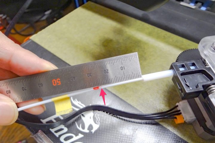 フィラメントを装着し基準の位置を決め、そこから計算しやすい100mmの位置に目印を付けておきます。