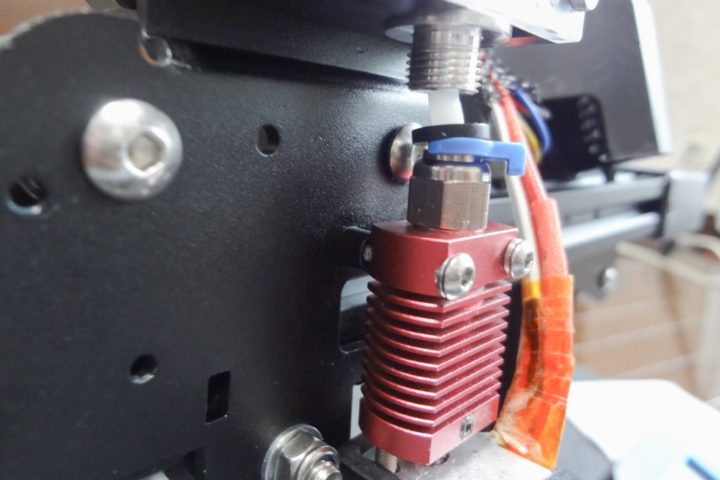 これだけなら短いスペーサーを追加してなどの策もあるのですが、ホットエンドへガイドするPTFEチューブも真っ直ぐ差し込むことが出来ず・・・