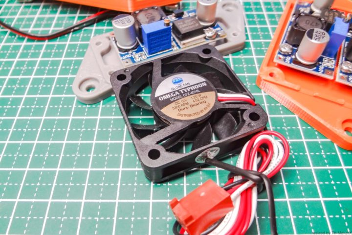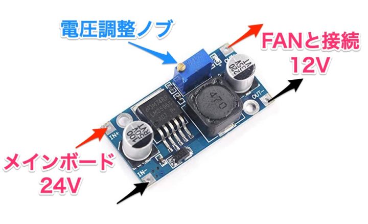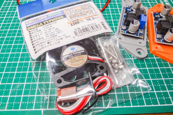 今回、造形物冷却用ファンにはFYSETCの24Vファンを使ったのでそのまま交換が可能ですが、ホットエンド冷却用ファンには12V駆動のAINEXファンを使っているためDC/DCコンバーターを使い降圧(24V→12V)する必要があります。