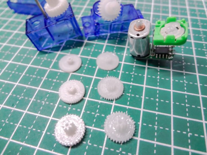 壊れたSG90を数台バラして各パーツの寸法を取りそれをCADでモデリングするわけですが、特にギアなんて非常に小さくその歯数を数えるだけでも写真を撮りその画像を拡大して数えていく・・・かなり大変な作業になりました。