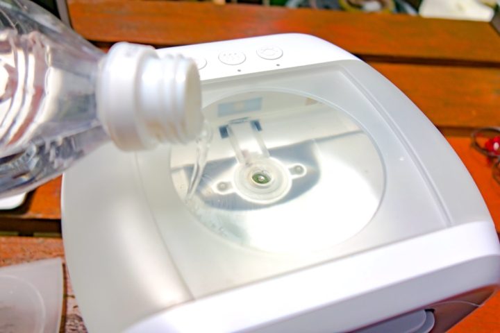 そしてミスト噴射モードを使用する際は、上部にある給水口のフタを外しタンク部分に水を給水します。(最大350ml)