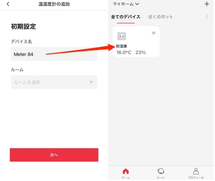 ペアリングが完了したらアプリからも温度と湿度を確認することが出来るようになります。(分かりやすいように名前を変更することも可能です)