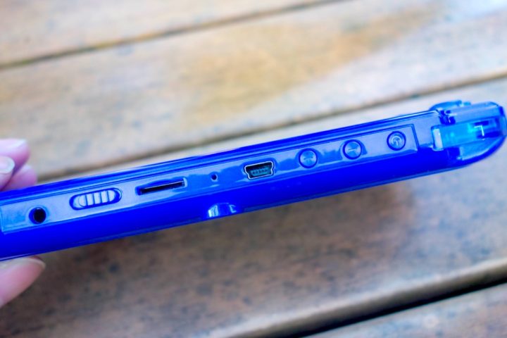 端子類は、上部にイヤフォンジャック(TV-OUT)に電源スイッチ・SDカードスロットル・MiniUSB端子・音量スイッチ。