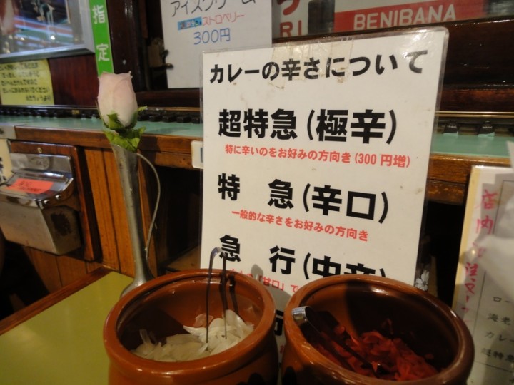 カレーの辛さは超特急(極辛)、特急(辛口)、急行(中辛)、鈍行(甘口)の4種類。