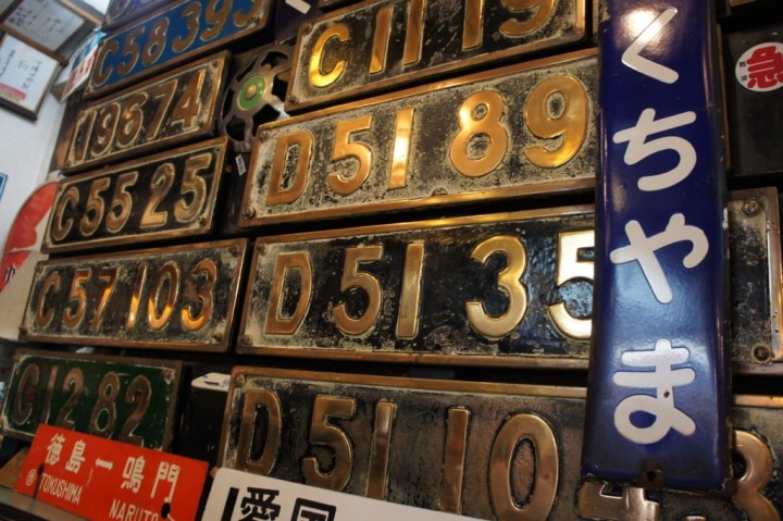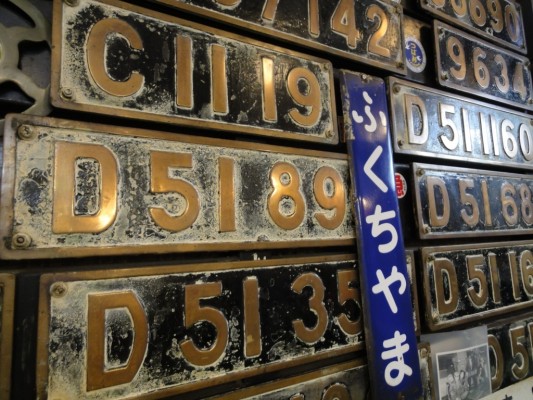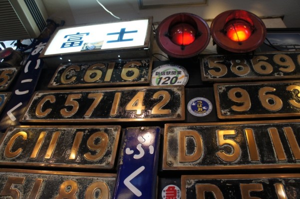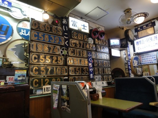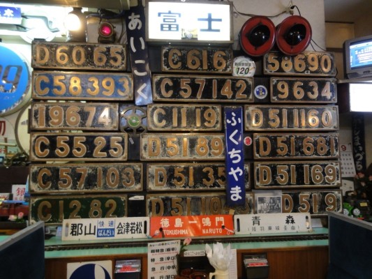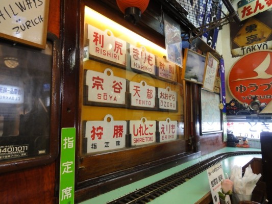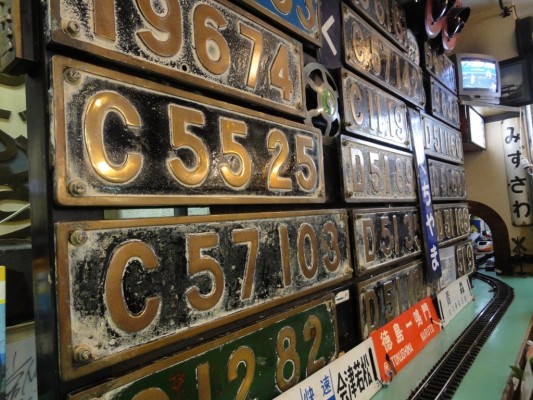 テーブル席は湘南電車80系の座席、壁には機関車のナンバープレート、