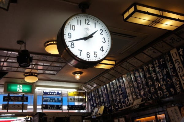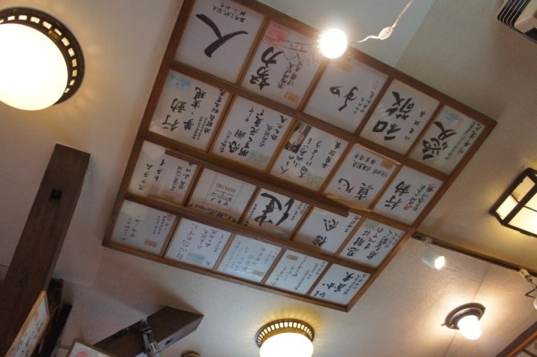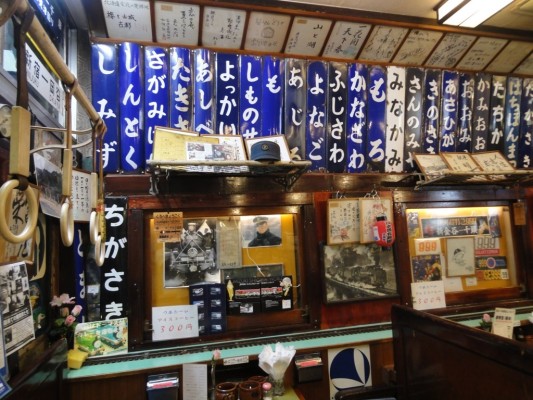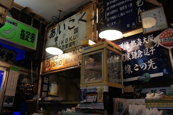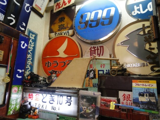 天井には駅の大時計、行先表示板、愛称版、ヘッドマーク、全国各地の駅長の色紙等がびっしりと貼り付けられています。