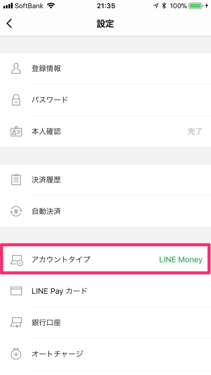LINE Payカード を発行し利用開始手続きを完了させた時点でのアカウントタイプはLINE Cashになっています。