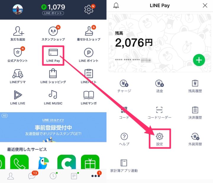 LINEアプリ内の【LINE Pay】から【設定】へ進みます。